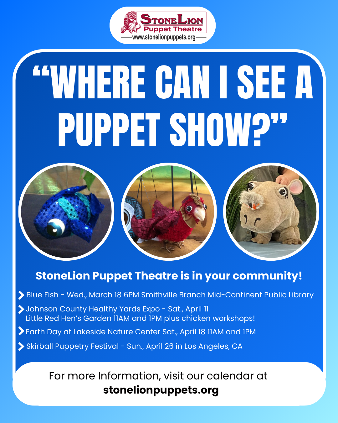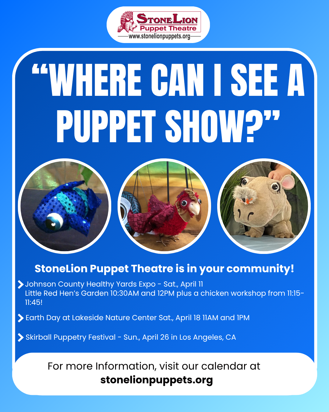 StoneLion Puppet Theatre is a professional not-for-profit theater company dedicated to expanding the horizons of the young and young-at-heart through the art of puppetry in an interdisciplinary community of ethnic and cultural diversity with an emphasis on environmental sustainability. Using multiple styles of puppetry, including marionettes, masks, shadow, mouth, and rod puppets, StoneLion Puppet Theatre brings the magic of world-class puppet shows right to your doorstep! Shows are fresh, original and educational and can be performed for groups of 30 or 20,000. Based out of Kansas City, Missouri, StoneLion tours throughout the Midwest, the United States and beyond!